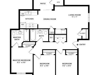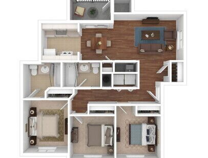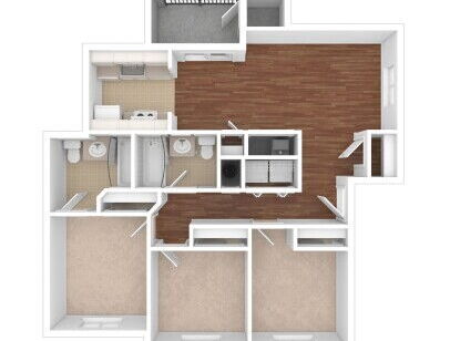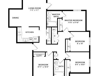 Our three-bedroom Cortland floor plan offers a spacious master bedroom with en suite, full second bath, open living and dining area, and a private patio or balcony.